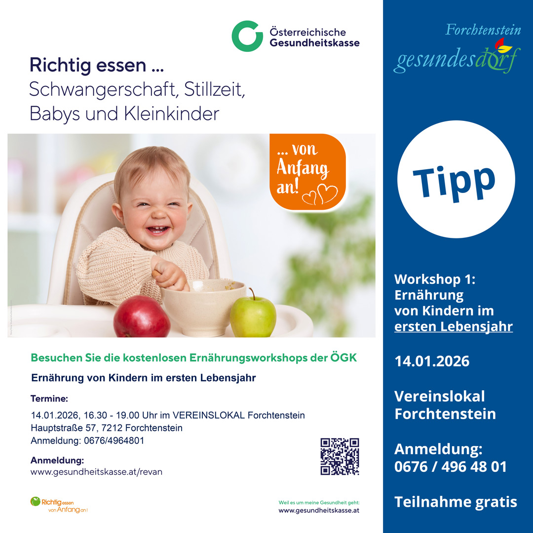 Gleich zwei Ernährungsworkshops von Diätologin Birgit Brunner finden im Jänner 2026 im Gesunden Dorf Forchtenstein statt. Beide verbindet das Thema „Richtig essen: Schwangerschaft, Stillzeit, Babys und Kleinkinder“.